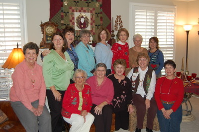 Yesterday, my quilting bee, The Piecemakers, gathered for our annual Christmas party. We had 100% attendance, all 12 of us, plus Mary S's mama. It has become a tradition to have our party at Sally's house (third from left, back row). Her house is lovely any time of year, but at Christmastime it's magical. Sally is such a great decorator, as well as a very talented quilter.