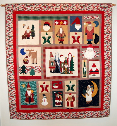 Back in the early 90s, when I first joined Piecemakers Quilting Bee, we did a Santa Quilt Challenge. We worked on the quilts all that year. I hand-appliqued the appliqued blocks and hand-quilted the entire quilt.