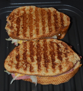 I found a new use for the George Forman Grill that our daughter Andy gave us a few Christmases ago. It makes perfect panini. These were made using thick slices of Italian bread, pastrami, cheddar cheese, sauer kraut, and mustard. I spread the bread with I Can't Believe It's Not Butter Light before grilling them. I probably broke about a dozen culinary rules by combining those things--but that's what I had in the fridge. And it was gooooooood!