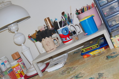 Just to show you that I am working on my spring cleaning/ organizing project, here's my art table. All my pencils, markers brushes, etc., are arranged in containers where they can be found and used efficiently.