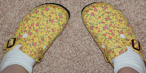 Don't tell anybody, but I got these cuties at Wal*Mart. Don't you just love the yellow-and-pink calico? They had them in madras plaids too, but I didn't like them so much. They were only like $12.98 or something--unlike Berkinstocks, which are X-pensive and UGLY! And these are comfy too.
