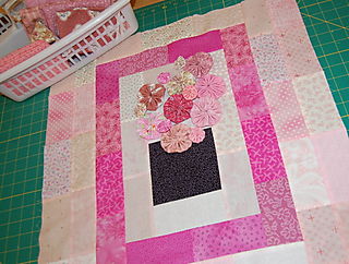 This is what I worked on yesterday. It's a small wall quilt for a pink SwapBot swap. It's supposed to be a vase of flowers in case you can't tell. The yo yos, which aren't yet attached, are the flowers. I'm pretty sure my Swedish swap partner doesn't read Blackberry Creek, so I don't think I'm giving away any secrets--I hope.