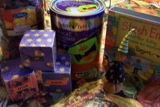 Gayle at Sparklejars has received her Trick or Treat Swap package from Lori at Morning Glories and Moonflowers. What a great bunch of goodies: hand-made trick-or-treat blocks, a colorful pumpkin witch, hot cocoa mix, pumpkin potpourri, and Lisa Boyer's great quilting humor book, Stash Envy, on tape. Looks like you put a lot of thought into this one, Lori. I know Gayle is tickled with her package. Thanks to both you girls for participating in Blackberry Creek's First Annual Trick or Treat Swap--which implies there'll be another one next year, doesn't it?