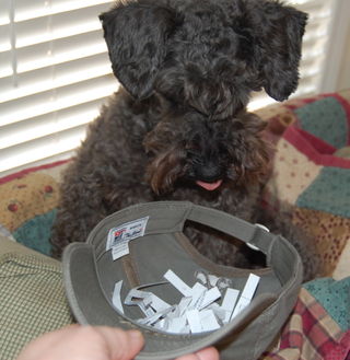 When I told Sophie she had the honor of drawing for the 700th Post Blog Winner, she seemed amenable enough to the idea. So I printed out all the comments, cut them apart, and placed them in Mr. Bill's cap (which he had left lying on the sofa while he and Vann are gone to Wal*Mart). I used Bill's hat because he's one of Sophie's favorite people (isn't everyone?) and I thought she'd like the smell. I even put one of her favorite treats in the bottom of the hat to entice her further.