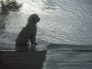I tried all day to get Sophie out for a nature call, but nothing doing. I would pick her up and take her out and put her down on the grass in the rain, trying to hold the umbrella so that it would protect us both (it didn't real help either one of us). She'd run right back to the door and huddle there until I let her in. We both stayed pretty damp all day from these efforts. Finally at about 6:00 last night, she'd had all she could take. She was running back and forth to the door and looking up at me with panic in her eyes. So I found an old rain coat and a hat of Vann's and got dressed. This time, I hooked Soph to the leash, determined that we weren't coming back till we got some actions.