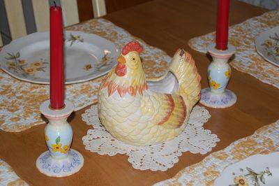 I think fan-folded cloth napkins would look cute in your chicken. Kinda like tail feathers! Sorry about the weepy day but I would think those are to be expected with all you've been thru. Just be thankful that it's not an every day event. You're still grieving so give yourself a break and just take it one day at a time. I think you're doing great. You're an inspiration to all of us.