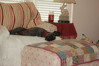 I had visions of me sitting in that chair, sans all the quilts, glass of wine in one hand, latest book in the other. Feeling like a lady of leisure. Not gonna happen. Soph has adopted it for her own. But that's ok. When you love a dog, you'll put up with a lot.