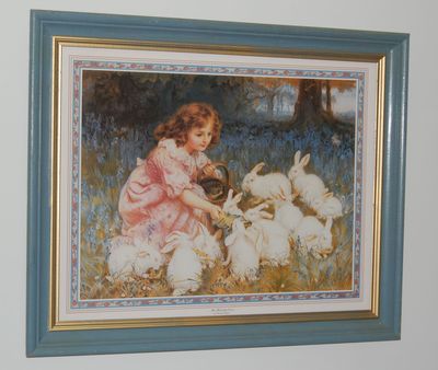 "More Watership Down" by Frederick Morgan (1856-1927). Morgan was an English painter whose work often featured smiling twinkly-eyed children, baby animals, and rustic settings. One painting of his featuring children and a puppy became an ad for Pear's Soap. I found this print at the thrift store for $10, then proceeded to spend $50 more on it after I tried to "repair" it.