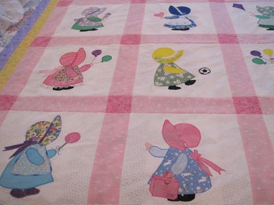 If you thought Sandy Gail's Sunbonnet Sue blocks were cute, just wait till you see the photos below of them joined together with pretty pink sashing and framed with beautiful bright borders. Great job, Sandy. I love this quilt!