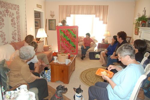 The above photo shows everyone who was gathered at The Yellow House yesterday for the October meeting of The Piecemakers Quilting Bee (except me; I'm behind the camera).