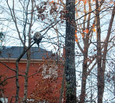 I hurried back through the house via the front door and out onto the back porch. There were my two little beasts surrounding a small tree, looking up, wagging tails, and barking fit to bust. Up in that little tree, out on a limb that didn't look nearly sturdy enough to support his fat self, was Mr. Marsupial, El Posso himself.