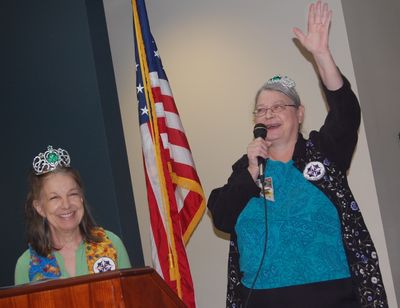 That's Birmingham Quilters Guild Co-presidents, Glenda and Helen, calling our March meeting to order yesterday. They're wearing tiaras with green blinking lights in honor of St. Patrick's Day.