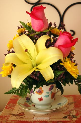 A belated Happy Birthday! That is just the cutest floral arrangement in a tea cup!