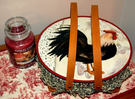 Beautiful presents from Andy: my favorite Yankee Candle, "Home Sweet Home," and a pretty rooster-covered basket to hold sewing or knitting--