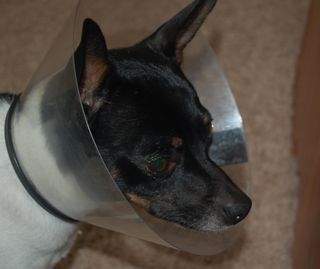 So now we have to doctor his eye with ointment three times a day--a task neither of us looks forward to--and keep him in his lampshade 24/7 for a week. I don't know whether I feel sorrier for Skipper or for me.