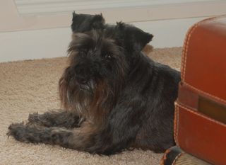 This is Curtis. Isn't he a handsome fellow? This is his first stay at Doggie Camp. He pitched a fit when his family first left, but finally he settled down, got up on the couch beside me, and said, "You can pet me now and sooth my separation anxiety." So I did.
