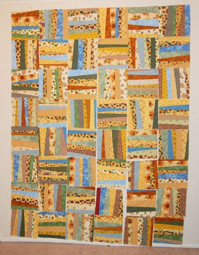 Taco and I finished the last few blocks for our "September" quilt this morning. "September" is what I've decided to call my sunflower quilt. I spray starched the blocks with Mary Ellen's Best Press lavender scented spray starch and placed them all on the design wall to dry. The next steps will be 1) sew the blocks together, 2) find border material and add borders, 3) add the sunflowers, and 3) decide on a longarm quilter to quilt it for me.
