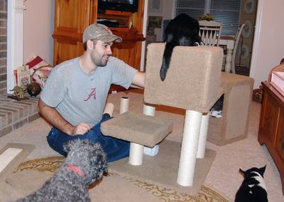 When we picked up the kittens from the spray/neuter clinic last month, along with two gloriously non-fertile, though ticked off, kitties, we got a most generous coupon for a purchase at a nearby pet supply store. Jesse knew just what we wanted to spend it on. No, not kitty food or kitty litter--a kitty condo. He felt that Taco and Bella needed such a structure in order to keep them entertained. The furniture, cabinets, sinks, bathtubs, blinds, and curtains were not enough, in his opinion. So yesterday afternoon, we went shopping and came home with a kitty condo.