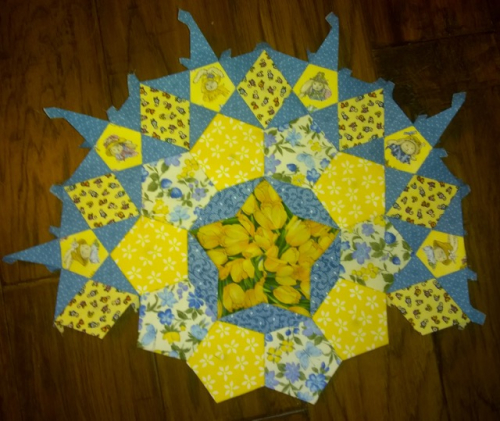 I am still working diligently on the rosettes for the millefiori quilt. Here’s one of the finished ones. I have a couple of more finished but no photos yet. And I’m working on two more. I can almost see the light at the end of the tunnel, as it were.