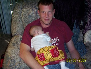 This is Miss Lily Grace and her dad Jason. Lily is wearing the pants I made for her last week. They're too big, but I bet they'll fit just right in a couple of months.