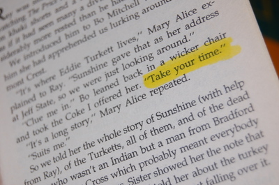 In one of the synchronistic moments that happen a lot in my life, I came to the words in the book, "Take your time," (photo above) at the absolute very same moment that the lyric is playing on tv, "Take your time." (It's that commercial for some Master Card of Burger King or something where the Buddy Holly song, "Take Your Time" is playing and people are running around in circles.) And I'm hearing the song, just like I'd been actually paying attention to the tv as well as my book.